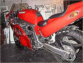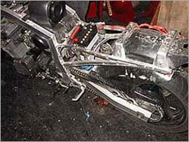 Refection du circuit electrique: Dans le cas present, on avait affaire à un adepte du rouge (visserie anodisée en alu qui devrait etre interdite, scotch, etc..). En effet le circuit electrique etait recouvert de scotch de mauvaise qualite et devait occasionner de serieux problèmes sous la pluie! Donc Il faut enlever le scotch, nettoyer le circuit à l'alcool, verifier les connectiques, les refaire avec du scotch thermo-rectractable vendu dans les grandes surfaces du bricolage